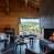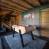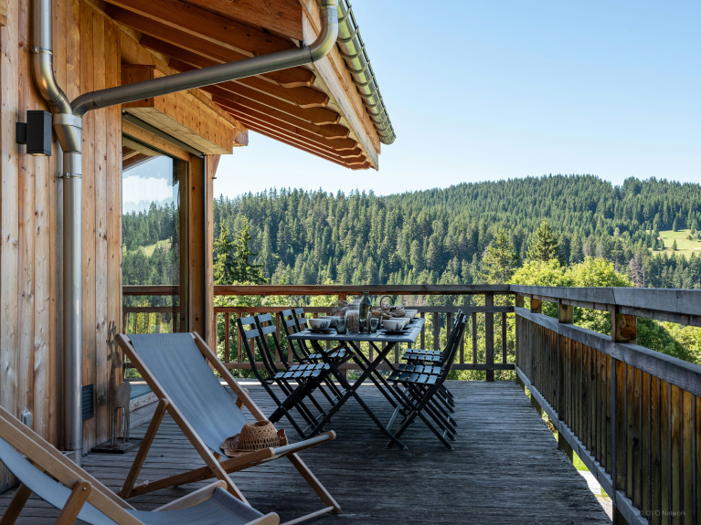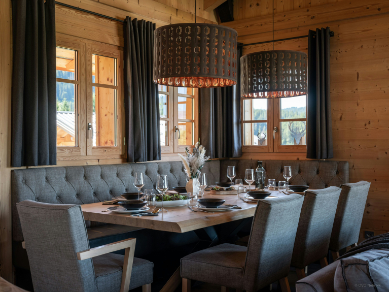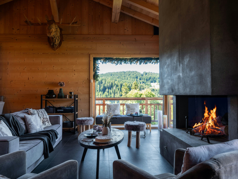 De open woonruimte, bestaande uit een woonkamer met open haard, een volledig uitgeruste keuken en een eettafel, beslaat de begane grond. Grote erkers aan één kant laten natuurlijk licht binnen en openen naar een terras, gemeubileerd met een tweede tafel en bank, met prachtig uitzicht op de Mont Charvin en het Aravis gebergte.