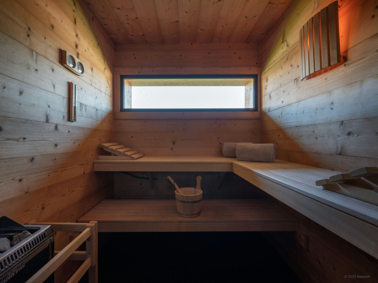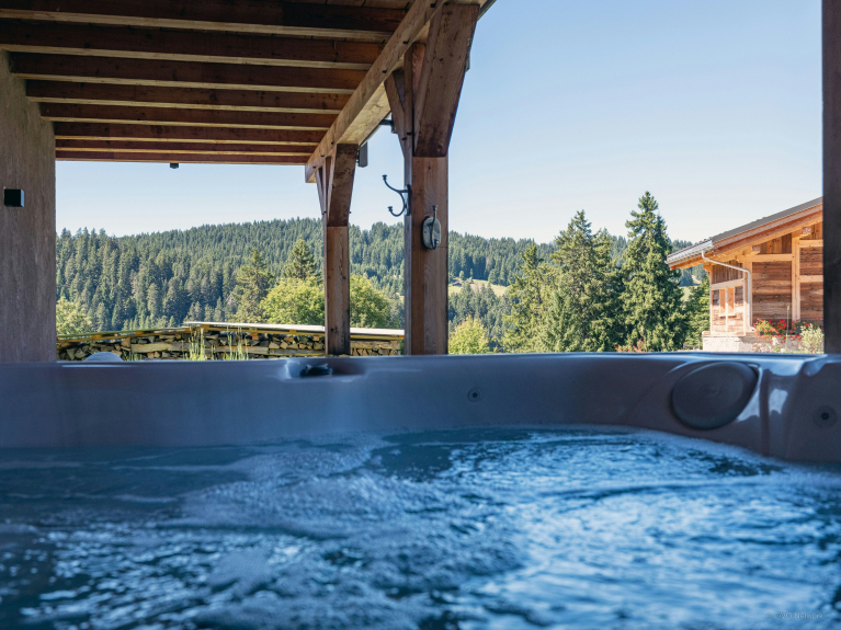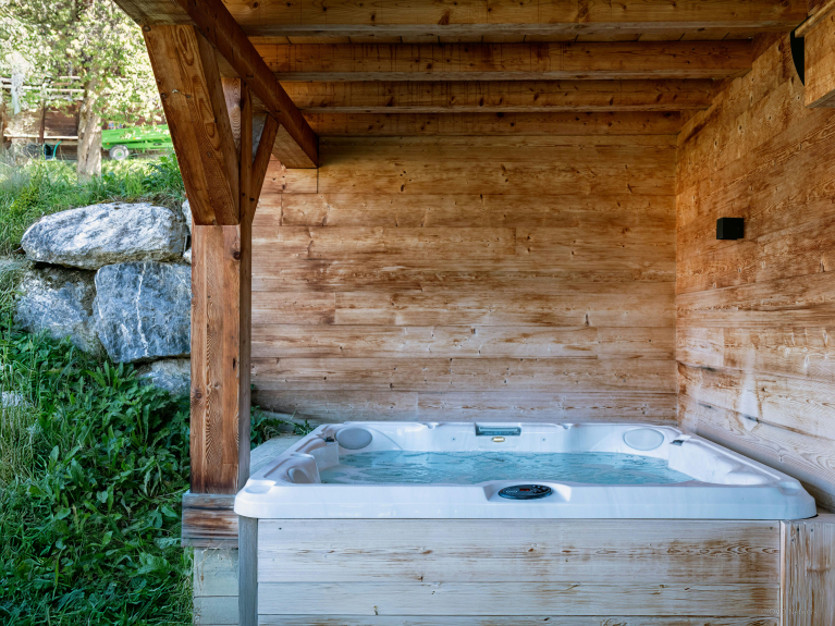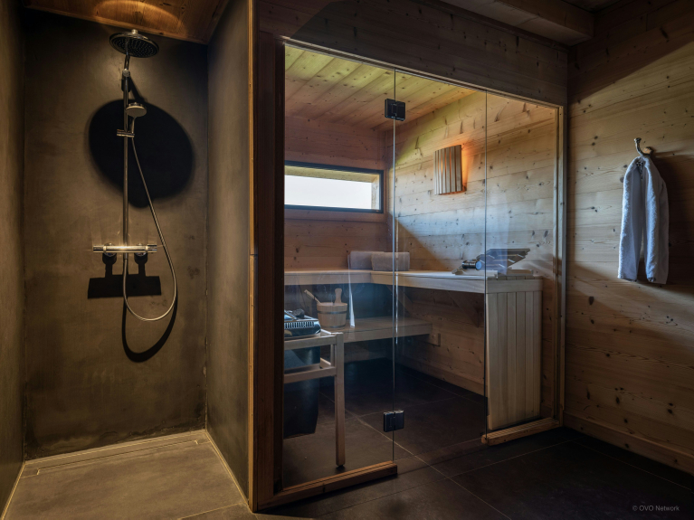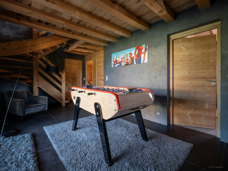 De benedenverdieping is gewijd aan welzijn en samen delen. Er is een sauna, compleet met douche, en een overdekte jacuzzi op het terras, voor momenten van ontspanning in het hart van de bergen. Een tafelvoetbaltafel zal de familieavonden verlevendigen.